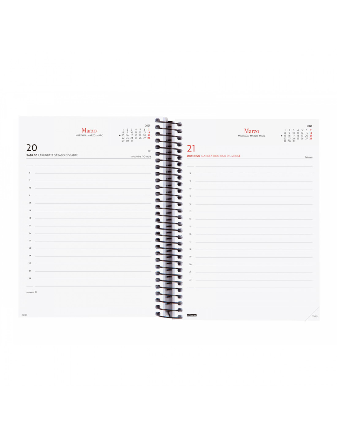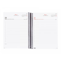 Agenda de espiral con tapas de polipropileno. Diseño en tendencia y a la moda. Ideal para uso personal y/o profesional. Con goma elástica. Con esquinas microperforadas para localizar rápidamente el día/semana en curso. La anualidad contiene la información útil relativa a: onomástica, festivos nacionales, cambios de estación y cambios de hora. La agenda incluye otros contenidos extra orientados a la organización personal. El diseño interior es limpio y fácil, con espacio suficiente para organizar tus proyectos, tareas y compromisos.