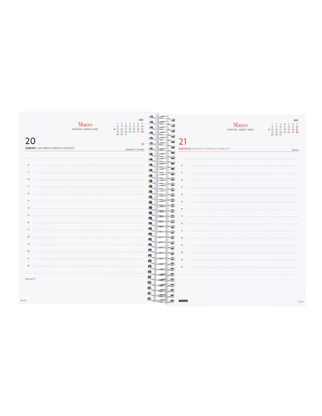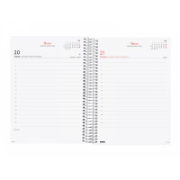 Agenda de espiral con tapas de polipropileno. Diseño en tendencia y a la moda. Ideal para uso personal y/o profesional. Con goma elástica. Con esquinas microperforadas para localizar rápidamente el día/semana en curso. La anualidad contiene la información útil relativa a: onomástica, festivos nacionales, cambios de estación y cambios de hora. La agenda incluye otros contenidos extra orientados a la organización personal. El diseño interior es limpio y fácil, con espacio suficiente para organizar tus proyectos, tareas y compromisos.