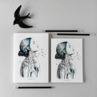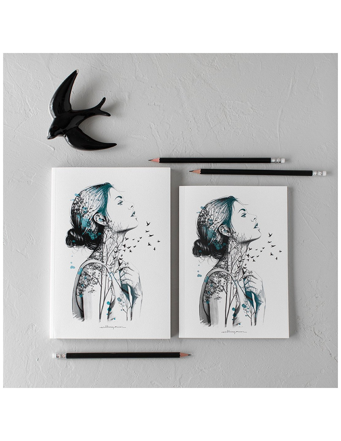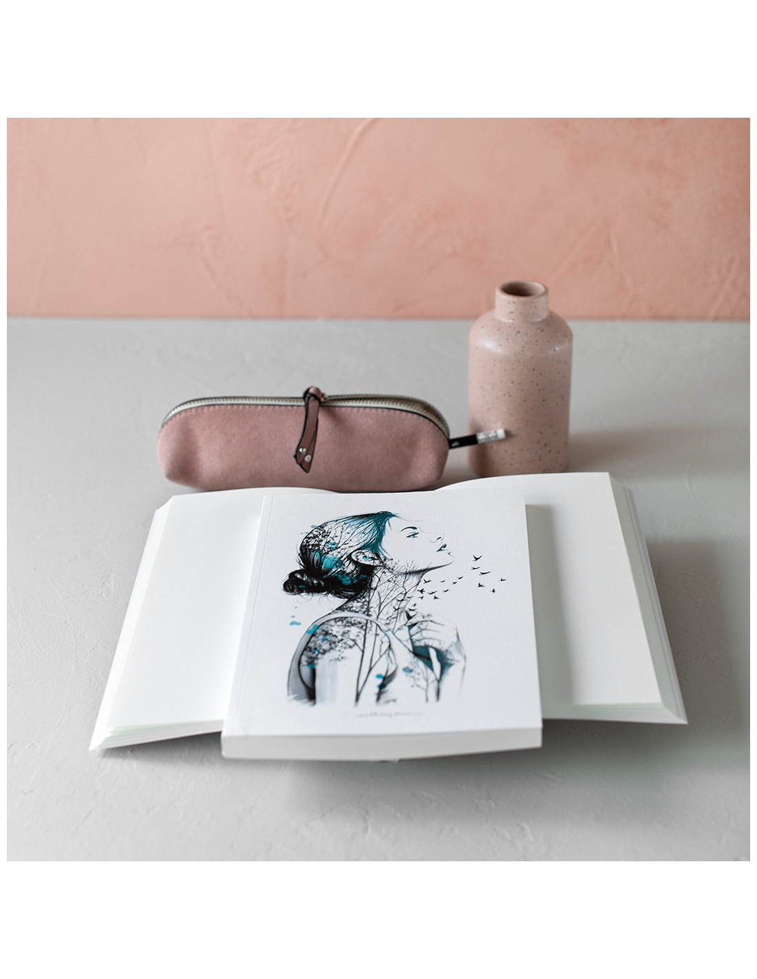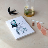Cuaderno de 160 páginas lisas. Formato: 17 x 24 cm. Papel interior de 120 g con ligero tono ahuesado. Encuadernación cosida con lomo. Cubiertas impresas en papel especial texturizado. Retractilado unitario.