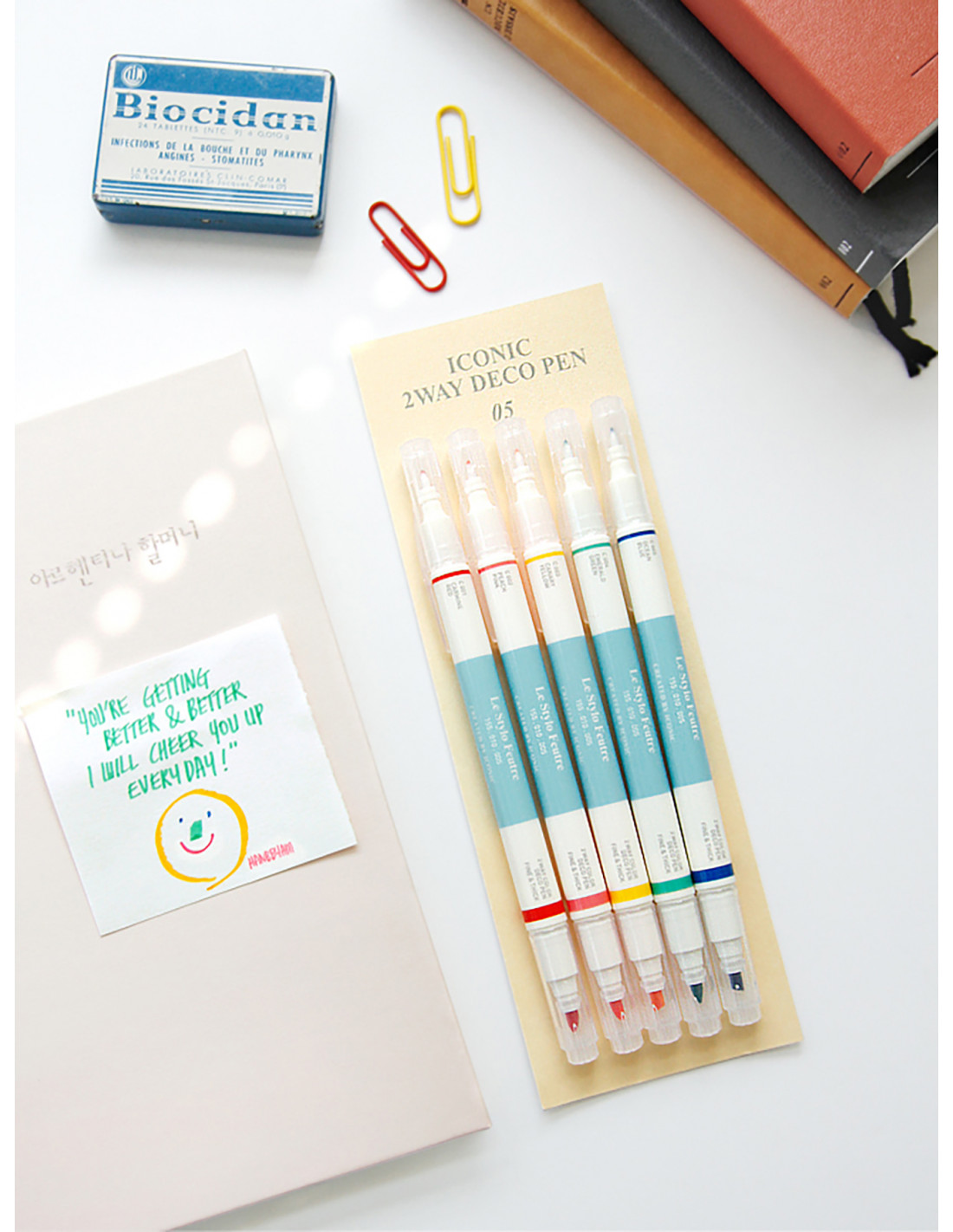 Set de 5 rotuladores con doble punta colores pastel. Cada rotulador tiene una punta gruesa y otra punta fina en total 5 colores diferentes. Tamaño 15cm. Colores pastel rosa, rosa, amarillo, azul y verde Punta fina y gruesa Diseñado por Iconic