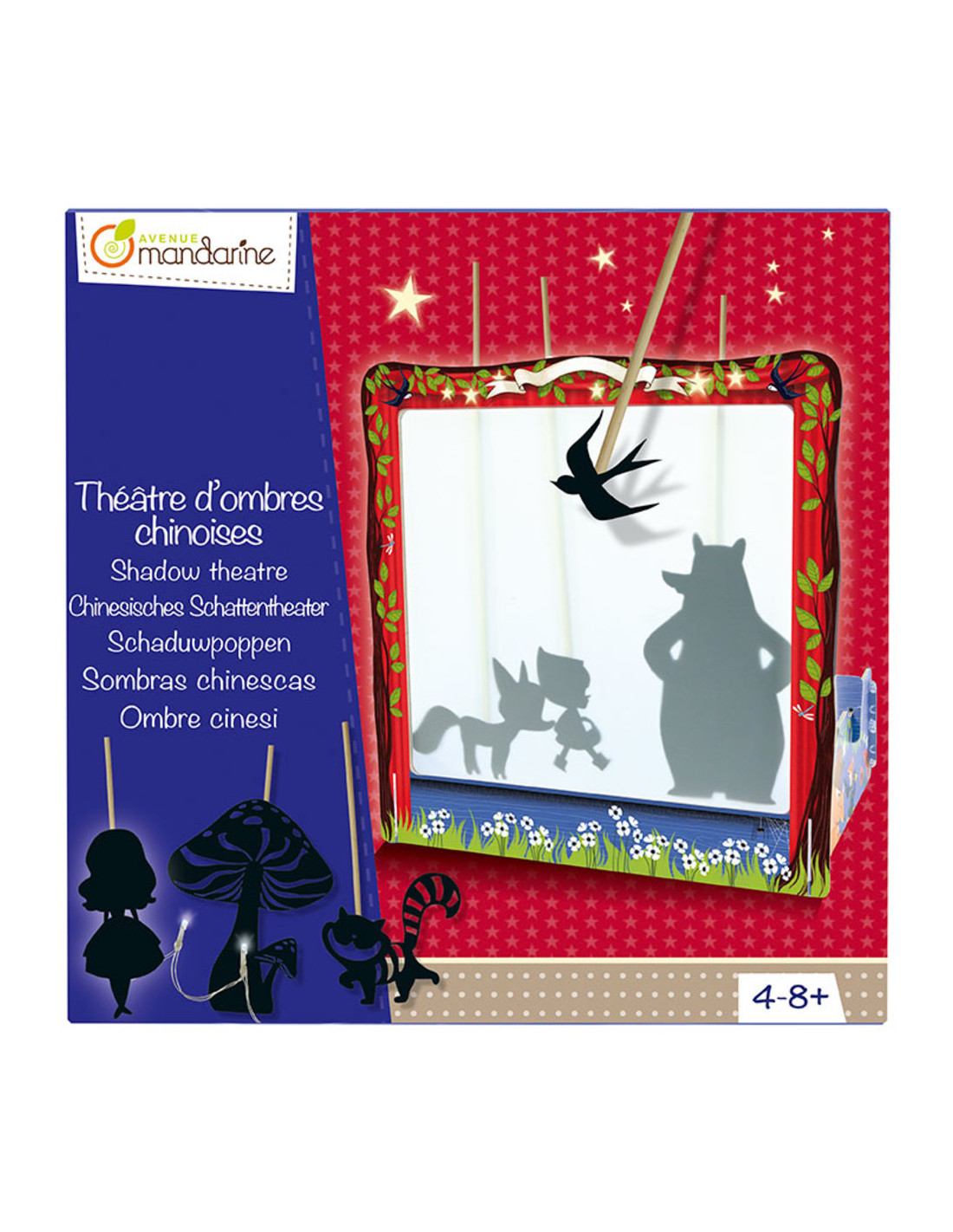Cofre creativo teatro de sombras chinas Avenue Mandarine ha creado este bonito teatro de sombras chinas para potenciar la creatividad y la imaginación de los niños, y crear agradables momentos en familia. Un decorado para montar, 28 personajes míticos y una guirnalda luminosa para iluminarlo todo dentro de una caja llena de poesía pensada para los amantes de historias bonitas. Contenido de la caja: ? 1 teatro de cartón para montar ? 1 hoja semiopaca ? 6 hojas de 4-5 personajes de papel precortados ? 28 bast oncillos de madera ? Guirnalda de 5 LED con interruptor (pilas no incluidas) ? 1 rollo de cinta de enmascarar ? 1 hoja de instrucciones