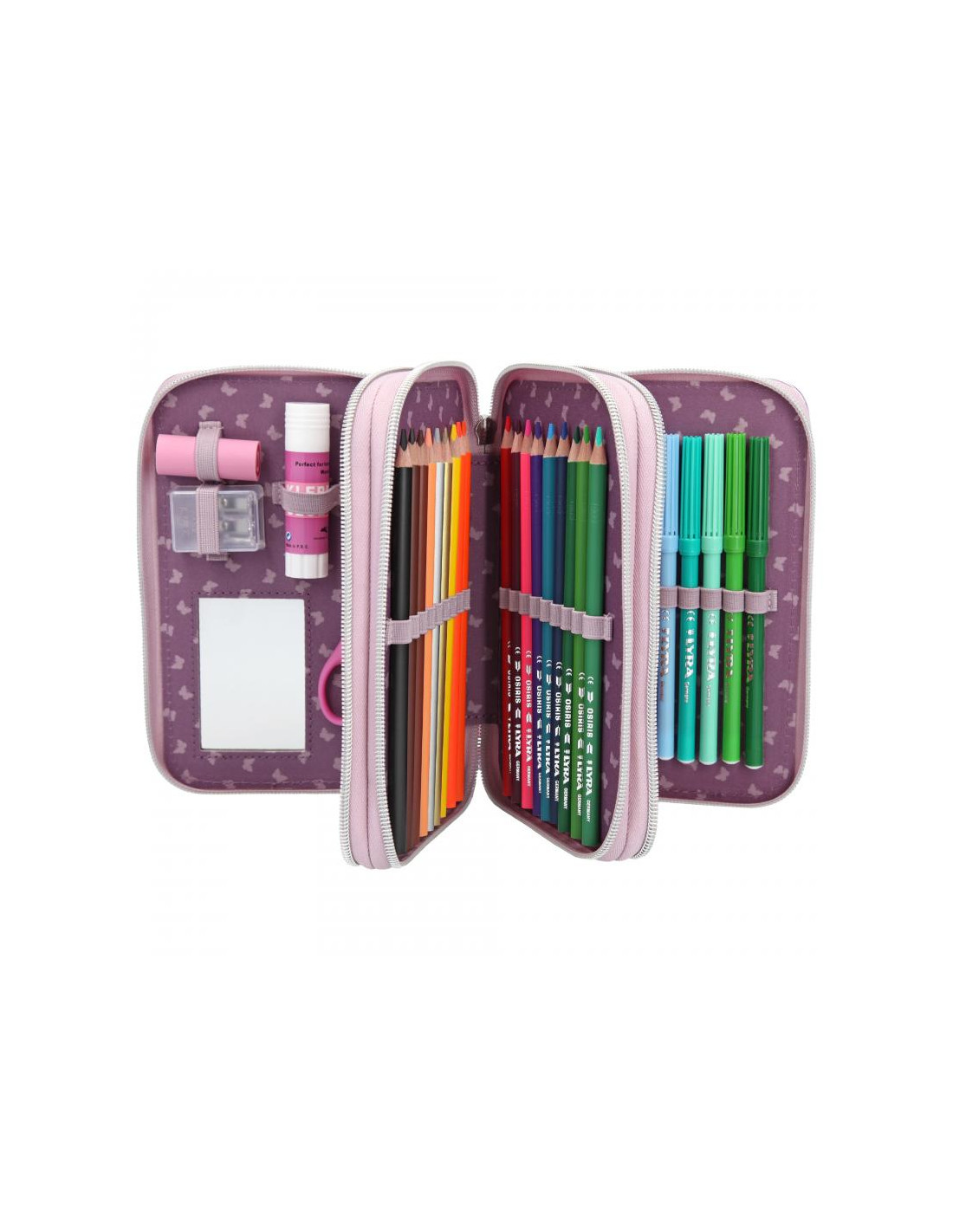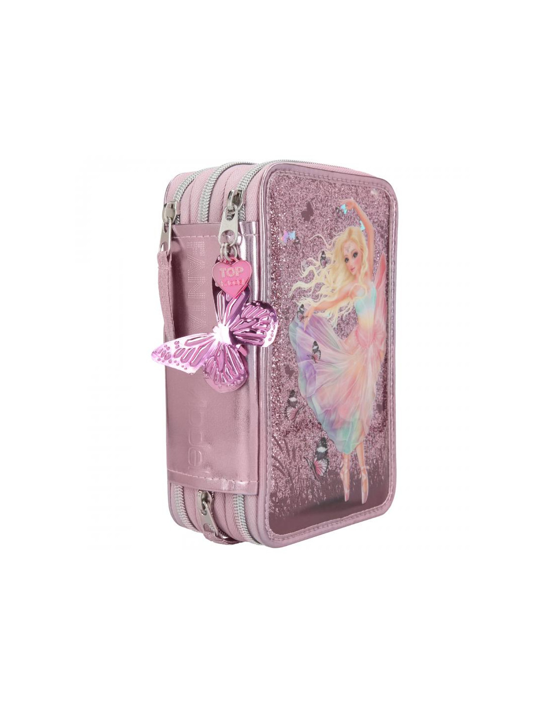 ¡Qué chulada! ¡Un estuche de tres compartimentos con mucho brillo y la supermodelo de TOPModel Lexy bailando ballet! Incluye 18 rotuladores y 18 lápices de colores, dos lápices, tijeras, sacapuntas, espejo y mucho más. ¡Para que la rutina escolar sea tan fácil como flotar!